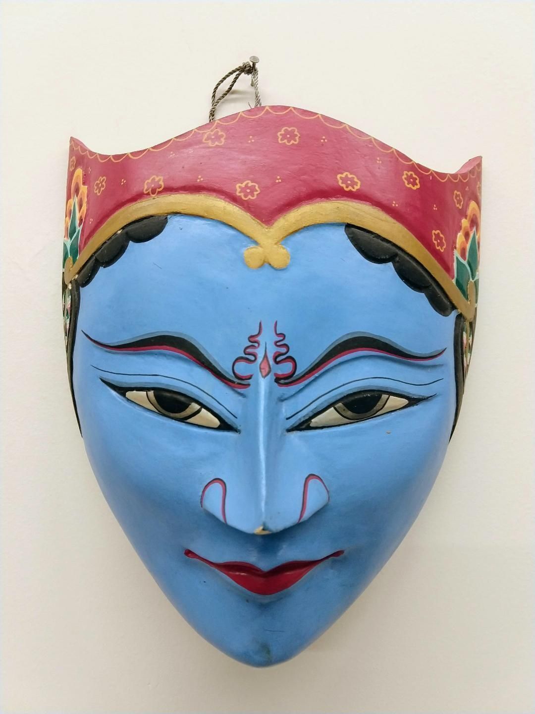 Indonesian theatric mask made of wood in vivid blue. 11" height and 9 1/2" width.