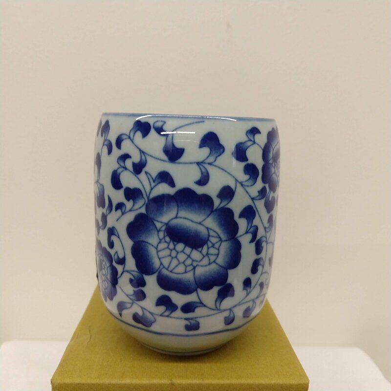 Blue flower tea cup, 2 3/8" diameter and 3 1/4" height.