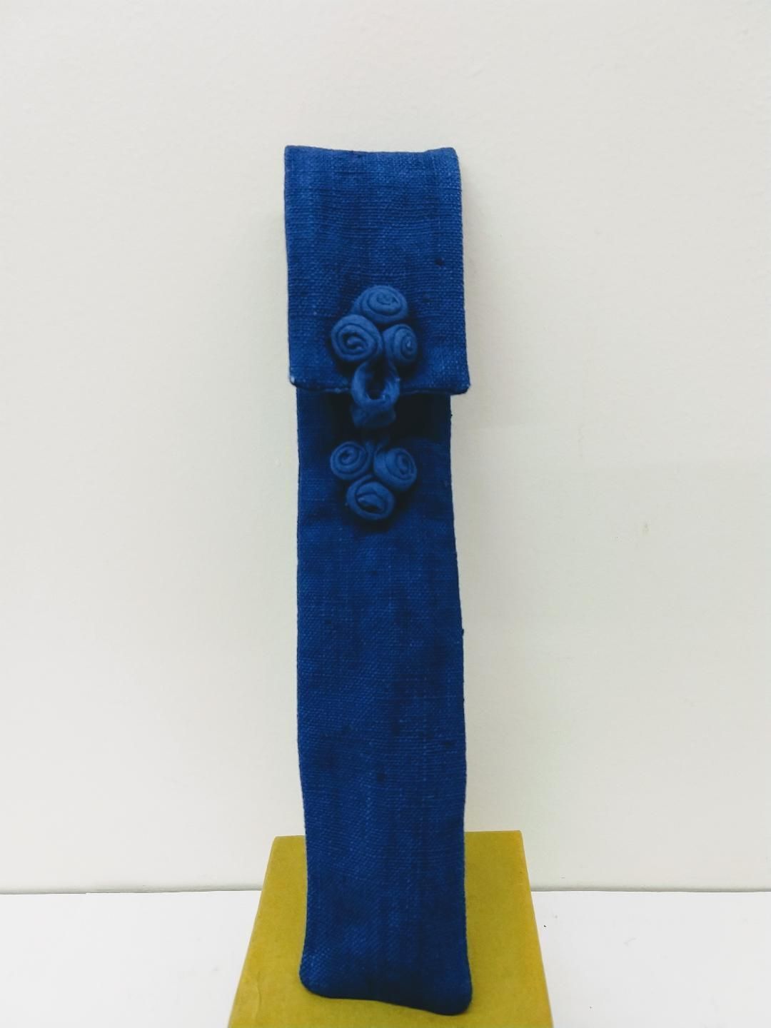 Cotton indigo fan bag with lining, flap design and frog knot closure. Used to carry and protect delicate fans.