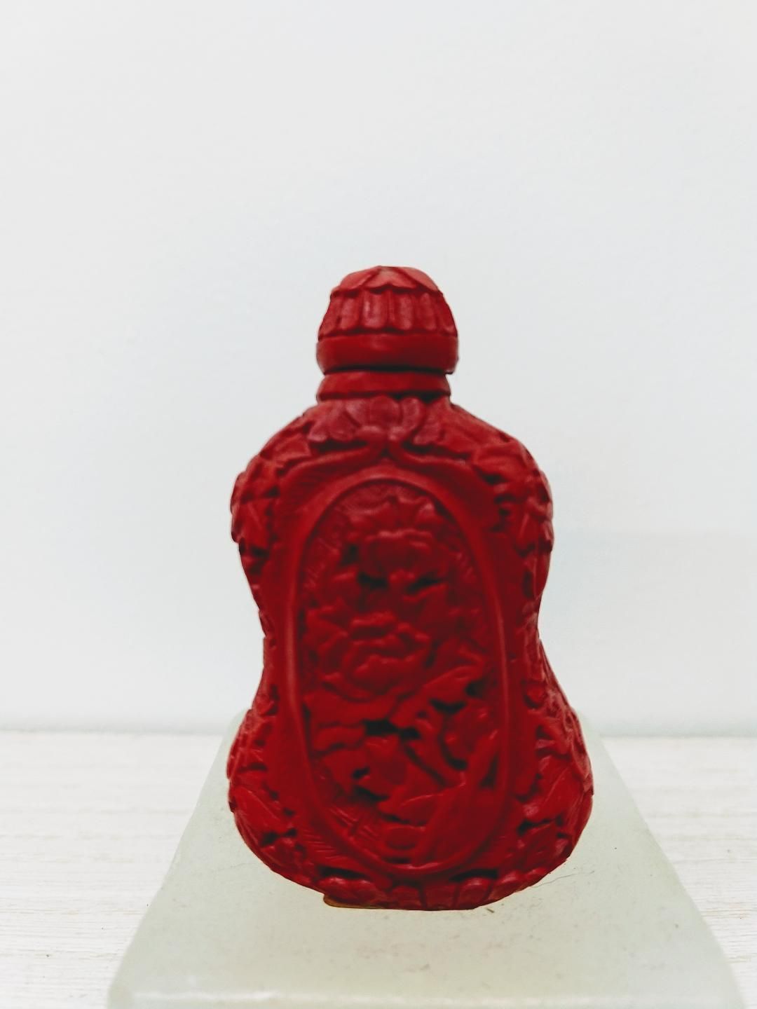Cinnabar lacquer snuff bottle with spoon, 2 3/8" height.