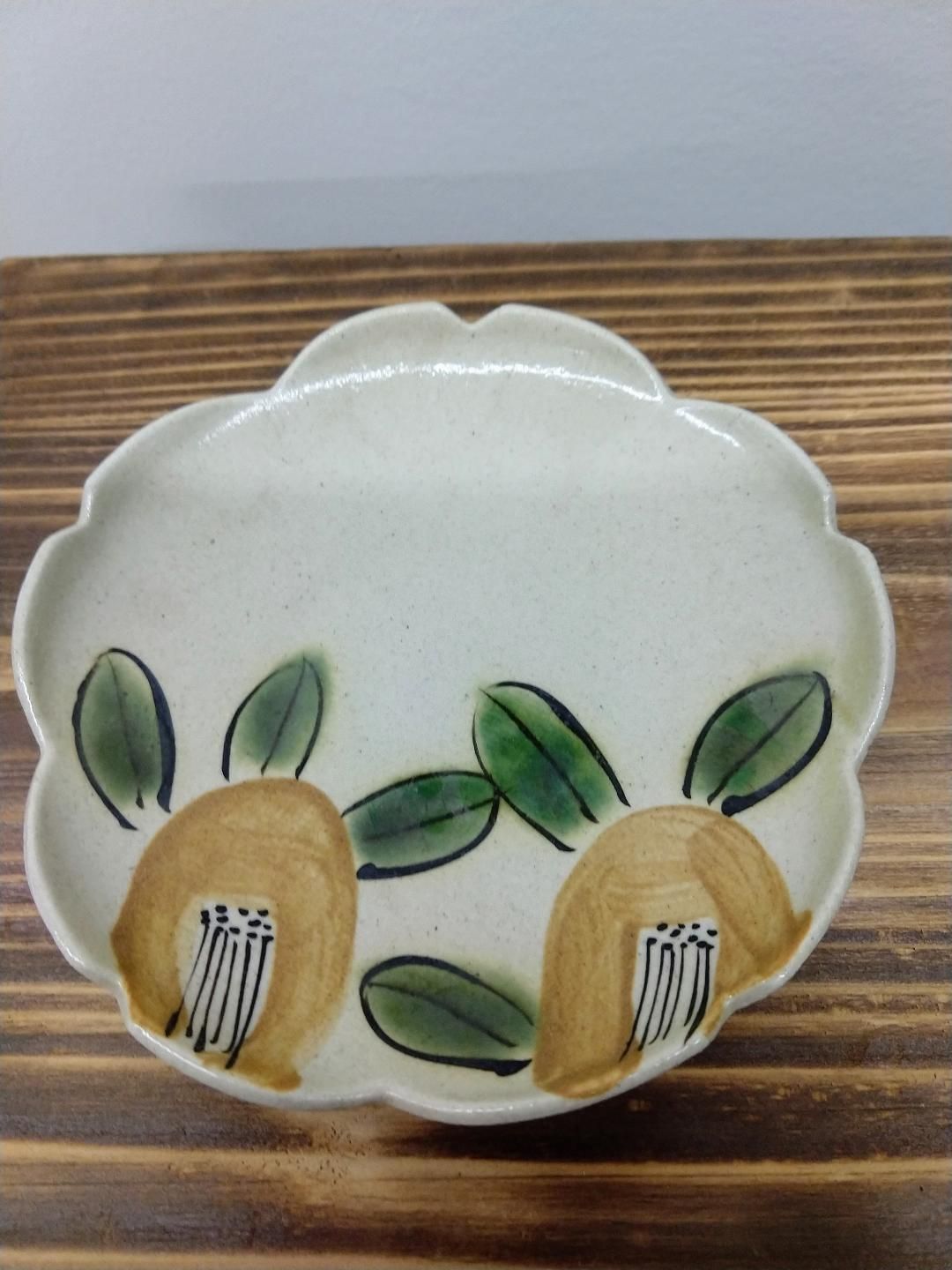 Beige dish with hand painted cherry blossoms. 4 7/8" diameter and stands 1" tall. Cloth textured surface top and bottom.