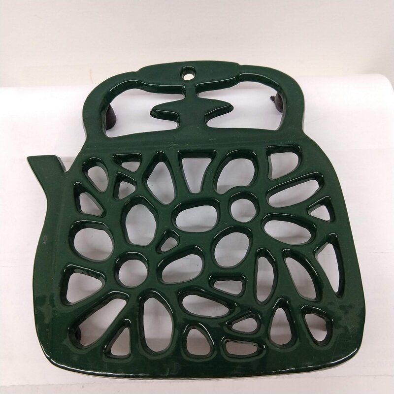 Green iron trivet in teapot shape with rubber feet to prevent skipping.