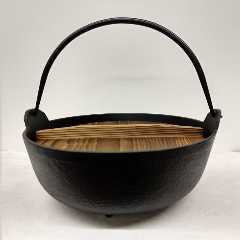 Heavy duty iron pot "Nabe" from Japan with handle and wood lid. A classic cooking utensil used on indoor fire pits in many traditional houses.This versatile cooking pot does last forever. Keep dry after use just like your iron teapots.