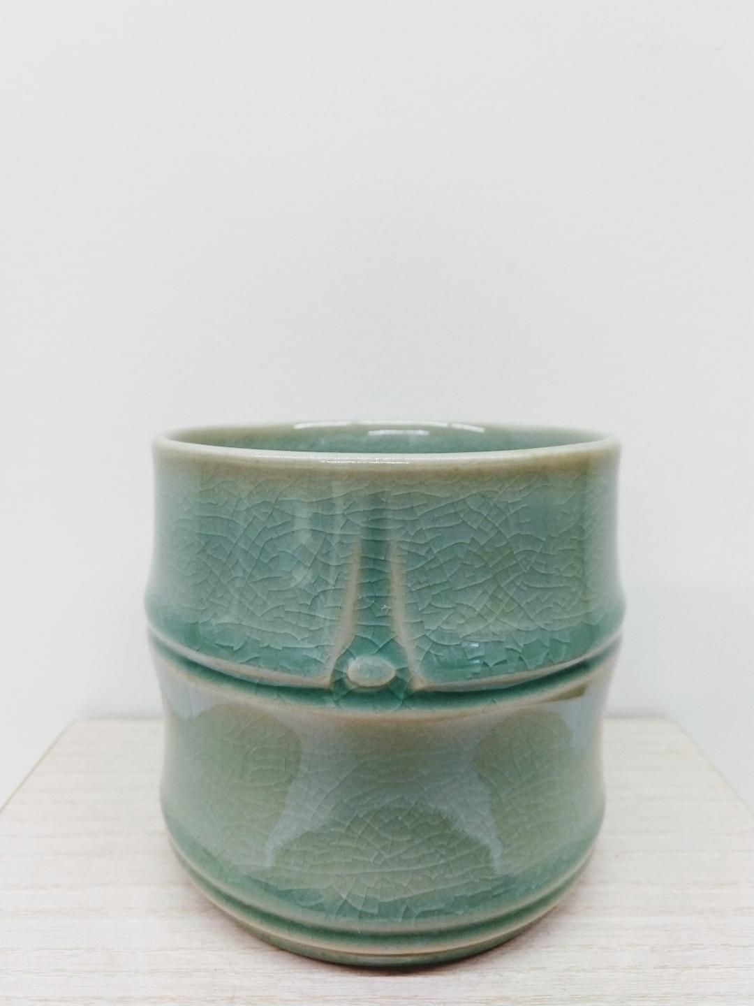 Korean celadon pen holder in bamboo motif with crackled glaze. Diameter