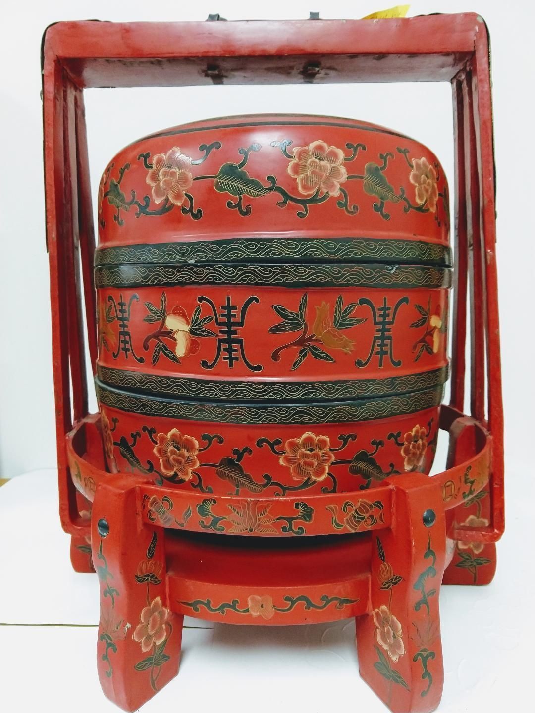 estivity Baskets are used to transport food or gifts to households from village to village to celebrate weddings and elders' birthdays. Baskets are carried on a bamboo stick on foot in old agricultural time in China. Red and gold are traditional festive colors. 18" height and 13 1/2 diameter. 2 deep 4" tall stack baskets with 4" lid painted with a soaring dragon on a stand with iron handle on top and iron plates on wood handle. Basket decorated with flowers, leaves and "Long Life" characters all around. Sold in "As Is" condition.