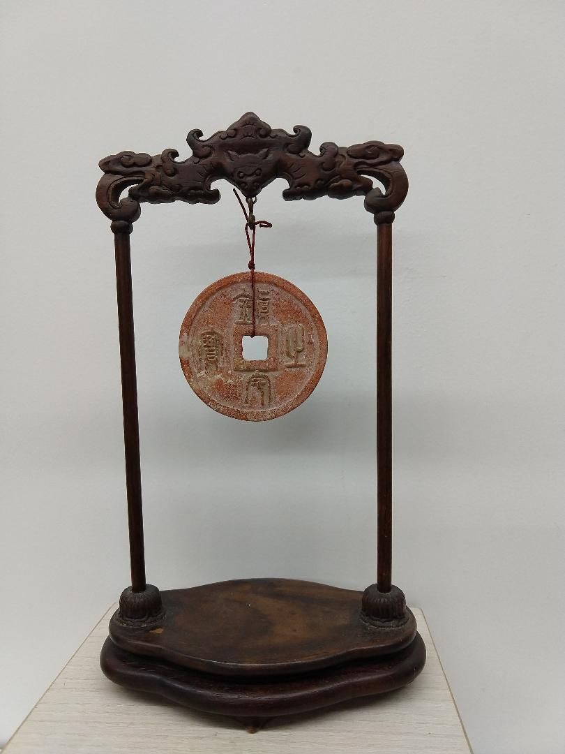 2 3/4" diameter stone coin on carved wood hanger. 10 3/4" height and 6 1/4" width.