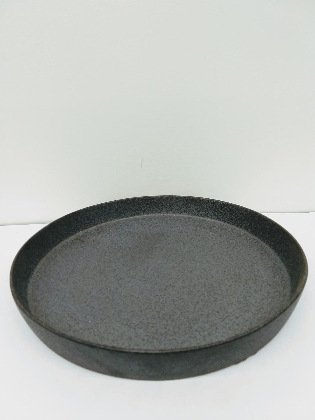 Gun metal grey flat dish with matte finish. 10" diameter and 1 1/4" high. Use to serve food. Also useful as a tray to serve tea.