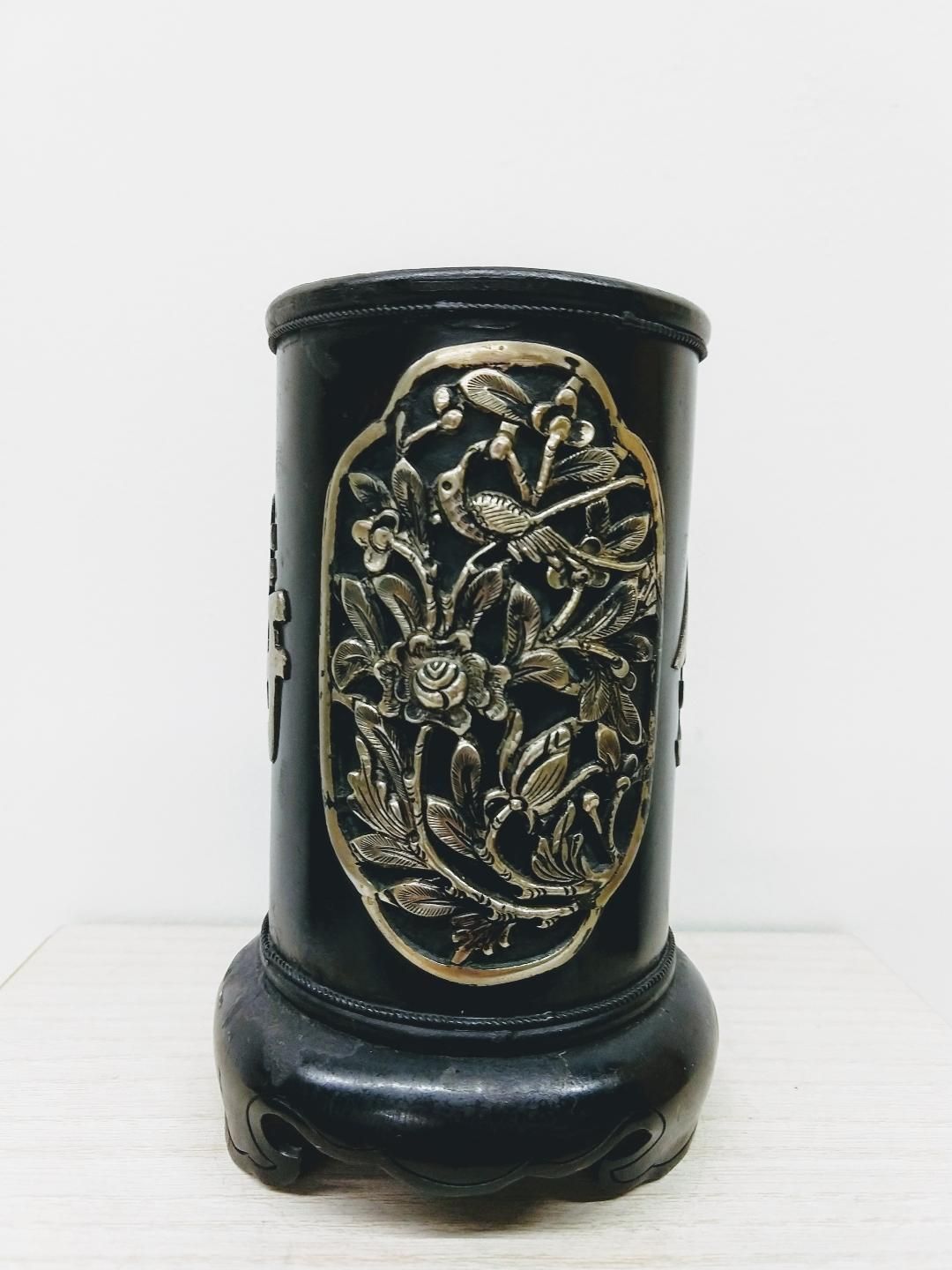 Weighty metal pen holder decorated with 2 detailed flower panels and 2 characters, Longevity and Prosperity. 2 5/8" diameter and 5" height.