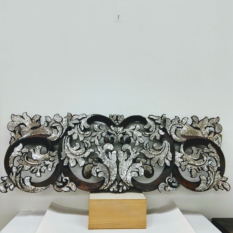 A wood carved wall hanging covered in tiny mirrors. 41" X 12". From Indonesia.