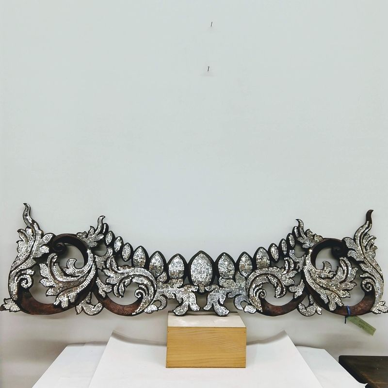 A wood carved wall hanging covered with small mirrors. 32.5" X 12". From Indonesia.