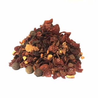 Caffeine-free and Organic. Satisfying blend of rosehips, cinnamon, orange peel, hibiscus, all spice and cloves.