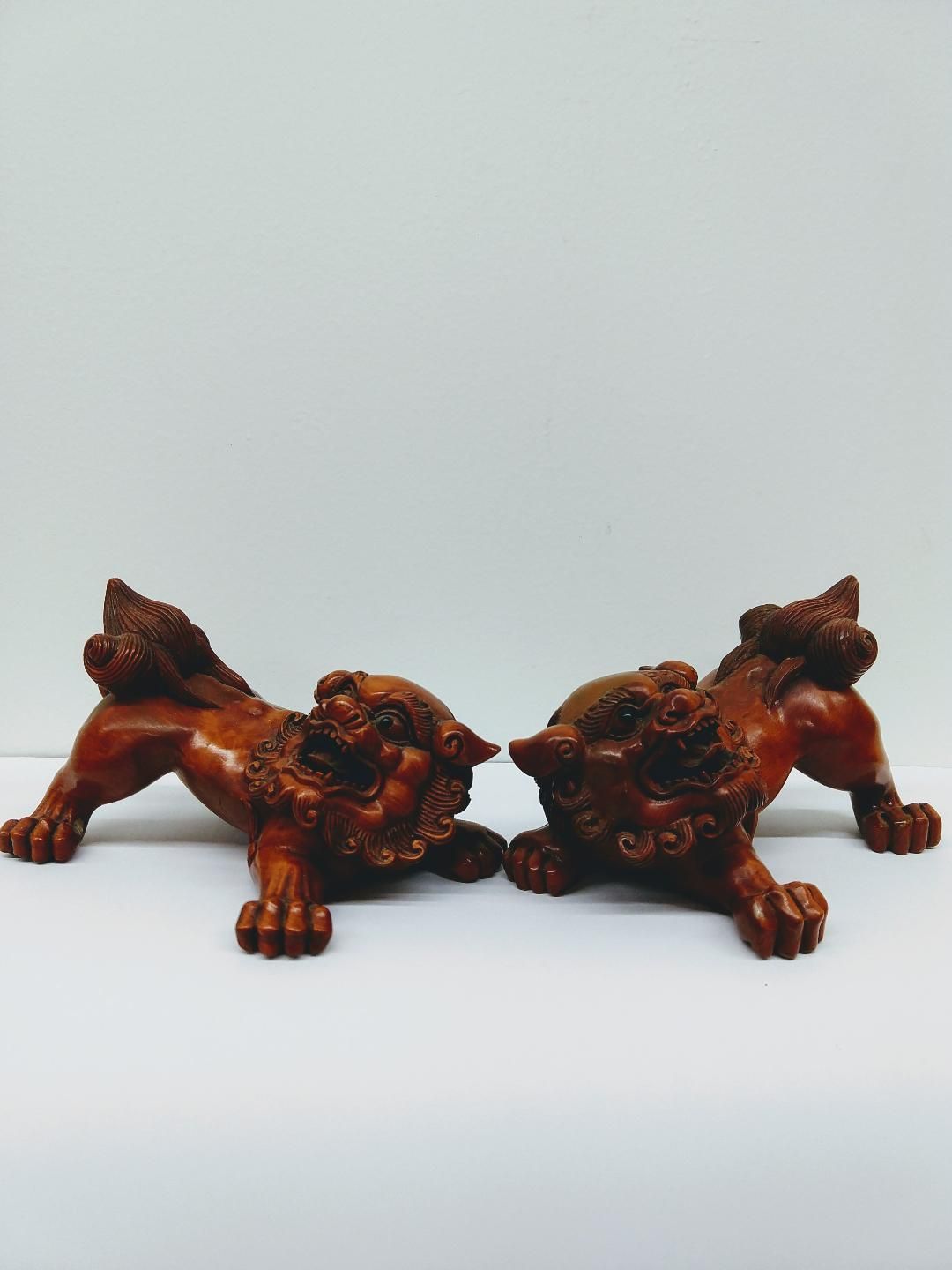 Pair of ferocious guardian lions in boxwood carving. 2 5/8" tall and 4 1/2" long. Large stone lions used to guard official Ministry buildings and temples facing opposite directions.