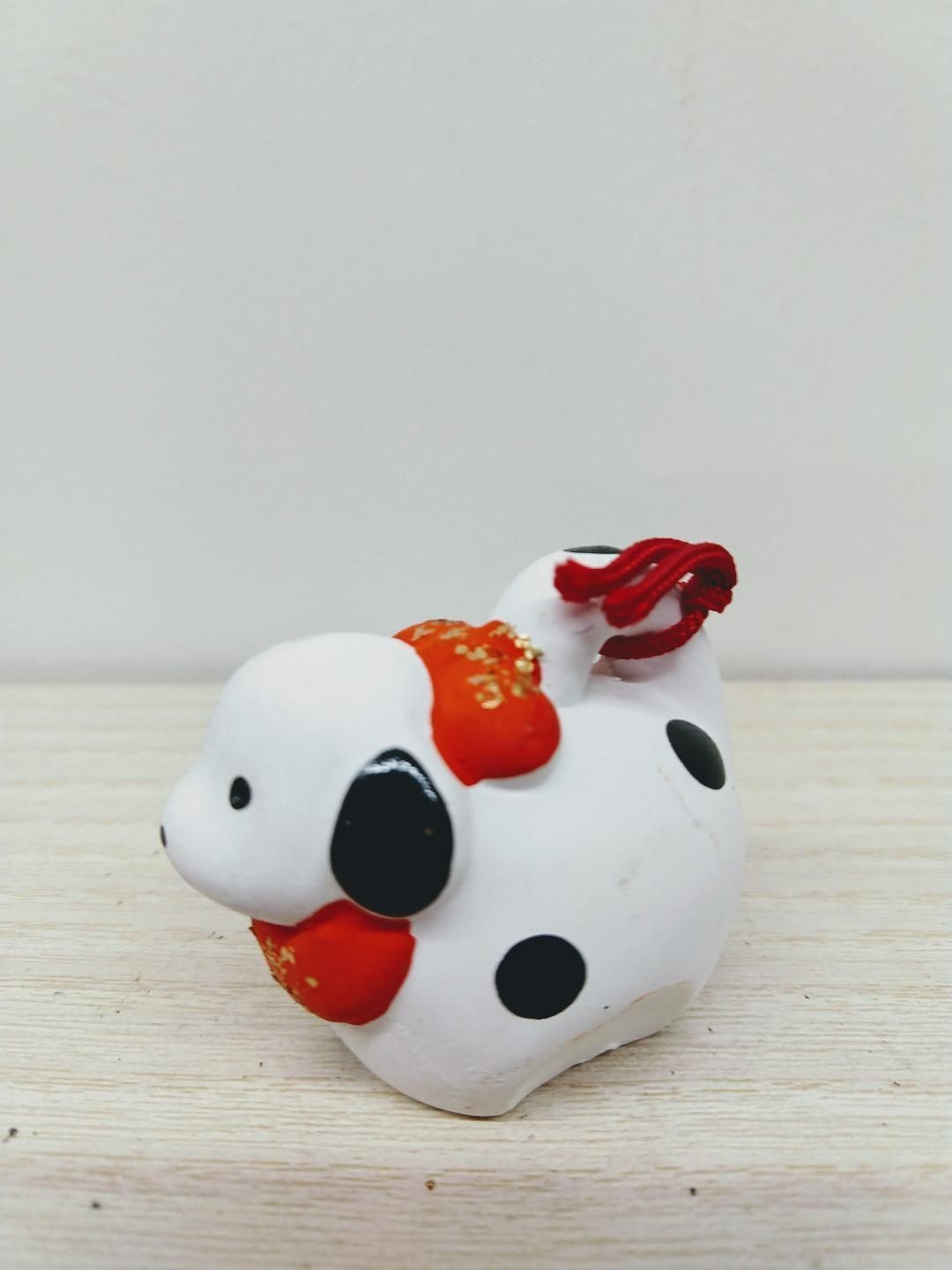 Small tail-up dog made of plaster with bell, 1 7/8" long and 1 1/2" tall.