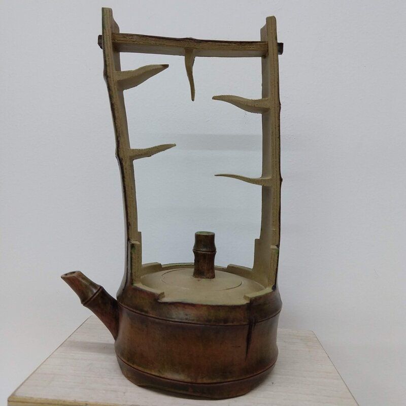 A striking tall bamboo shoot clay teapot. 8 3/4" height and 5 1/2 diameter. Comes with own case.