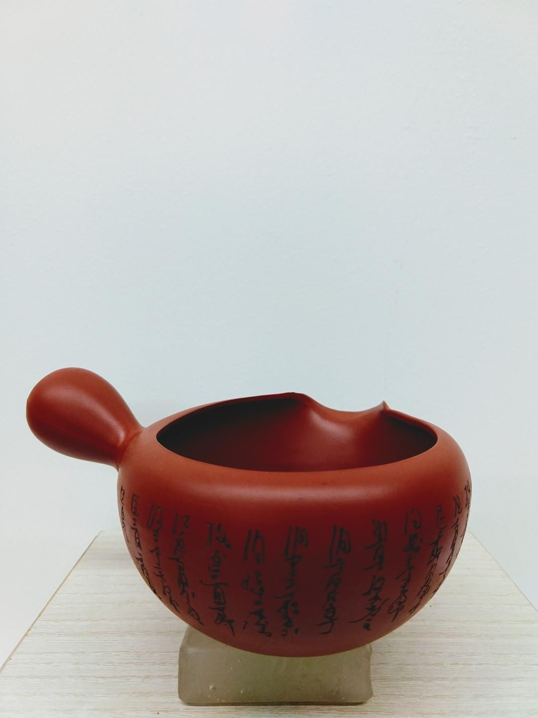 Unglazed clay color Tea Pour with handle and inscribed poem. Tea Pour is used for serve tea, just like decanters for wine. 4 1/4" diameter of Tea Pour and 2" handle.