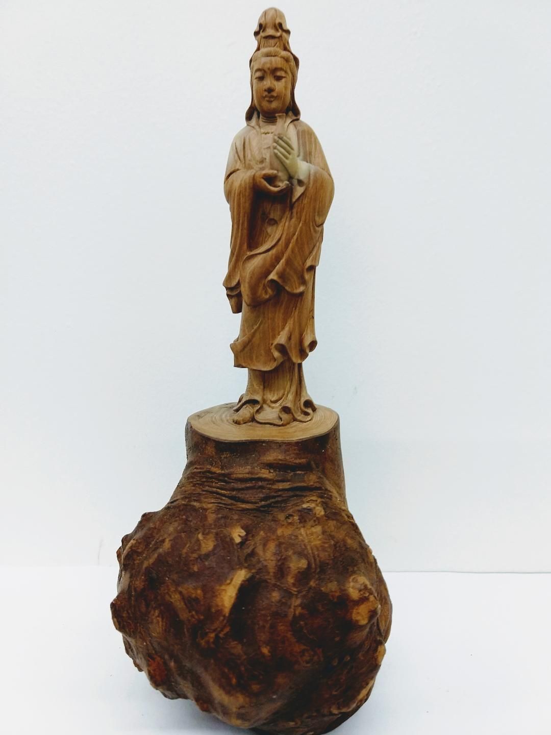 8" tall Kuan Yin statue standing on tree root it was carved out of. Kuan Yin, a Buddhist deity, is a symbol of compassion, generosity and kindness.